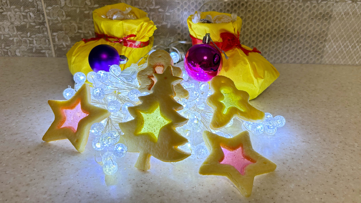 Это хрустящее печенье вырезается в форме праздничных фигурок и наполняется леденцами, затем выпекается, а конфеты плавятся образуя ровный слой для красивого эффекта витражного стекла. Очень здорово сделать такие пряники, упаковать в коробочки и подарить родным и друзьям. А еще их можно повесить на ёлку! Такое точно запомнят Ваши дети и это может стать доброй, новогодней традицией! Ингредиенты: ✔сливочное масло 82,5% - 220 г, комнатной температуры ✔ сахар - 200 г ✔ яйца категории С1– 2 шт ✔ мука пшеничная - 480 г ✔ кукурузный крахмал - 65 г ✔ соль – 1/3 ч/л ✔ванильный сахар – 1 ч/л Для оконного стекла: ✔леденцы – 170 г. Все ингредиенты для теста должны быть комнатной температуры, сливочное масло и яйца нужно заранее достать из холодильника. Просеиваем муку, кукурузный крахмал и соль в большую миску. Перемешиваем. В миксере с насадкой-лопаткой взбиваем вместе сливочное масло и сахар. Перемешивая на средней скорости, по одному добавляем яйца. Затем добавляем ваниль или ванильный сахар,