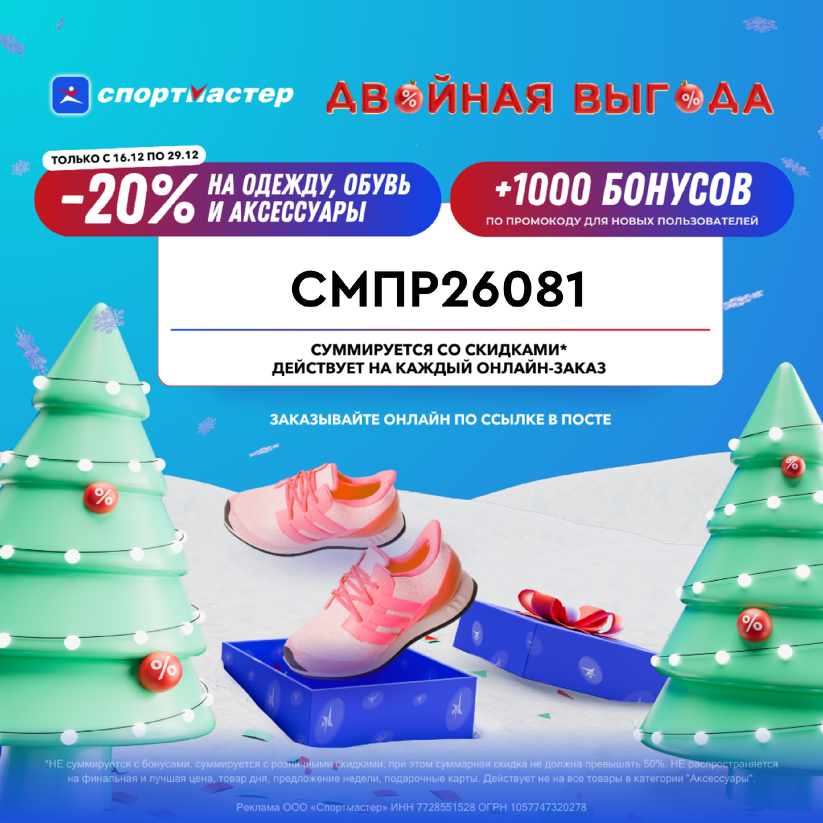 * НЕ суммируется с бонусами, но суммируется с розничными скидками, при этом суммарная скидка не должна превышать 50%. НЕ распространяется на товары из категорий: Финальная и Лучшая цена, Товар дня, Предложение недели, подарочные карты. ** 1000 бонусов для новых пользователей начисляется только при регистрации в приложении в день покупки. Действуют 30 дней со дня первой покупки. Реклама ООО «Спортмастер» ИНН 7728551528 ОГРН 105774