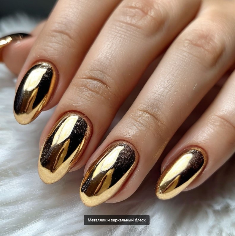 Ногти, покрытые хромом и создающие зеркальный эффект, станут настоящим трендом. Выбирайте золото, серебро или даже цветной металлик — всё в ваших руках.