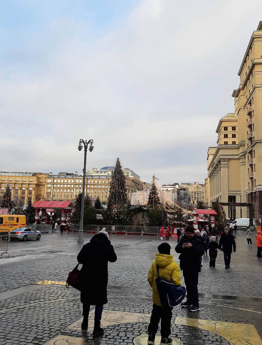 В четвертый раз хорошо позавтракав в гостинице, мы отправили на пешеходную прогулку по нарядной предновогодней Москве. Утром выглянуло солнце и быстро посветлело, что нас не порадовало, потому мы мечтали еще раз увидеть сияющие новогодние украшения. Шучу немного. Для питерцев солнце в декабре в 9 утра это сказочное мероприятие. Экскурсия длилась 2 часа, градусов было -4, все сияло, мы двигались довольно медленно, подолгу стояли,слушая экскурсовода. Было интересно, но холодно. На шее у нас висели радионяни и слышно гида было хорошо отовсюду. Мы прошли по парку "Зарядье", который расположен на месте гостиницы Россия, где я в годы СССР, когда-то жила и видела живого Харламова. На 21 этаже из окон ресторана мы разглядывали Москву, считали сколько видно куполов церквей. Парк расположен в одноимённом историческом районе Москвы, созданный на месте снесённой в 2006 году гостиницы «Россия». Расположен на территории площадью в 13 га между Китайгородским проездом, улицей Варваркой и Москво