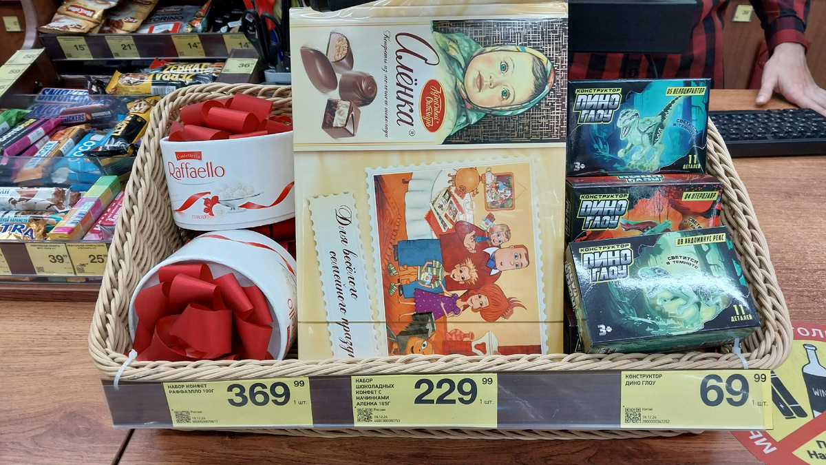 Всем привет, мои дорогие друзья, подписчики и гости моего канала.Ушла из магазина не с пустыми руками, покажу что купила и сняла для вас небольшой обзор. Магазин находится по адресу Ростовская область, Зерноградский район, станица Мечётинская, улица Ленина, 27 В корзинке возле кассы набор конфет Раффаэлло, 100 г цена 369.99 руб. Набор шоколадных конфет с начинками Алёнка ,185 г цена 229.99 руб. Конструктор Дино Глоу цена 69.99 руб. Вино игристое Массимо Висконти Ламбруско белое сладкое, 0.75 л цена 519.99 руб. Набор Мартини Фиеро 0.75 л + 2 банки тоника 0.33 л в подарок цена 1039.99 руб. Вино игристое Российское премиум белое полусладкое 0.75 л цена 239 руб. Конфеты А.Коркунов шоколадная палитра 143-165 г цена 269.99 руб. Вино игристое Куатро Валли Ламбруско Бьянко Эмилия белое сладкое 0.75 л цена 379.99 руб. Набор конфет Родные просторы 172-180 г цена 178.89 руб. Ананасы Золотая долина консервированные кружочки 580 мл цена 149.99 руб. Горошек зеленый ГОСТ 400 г цена 69.99 руб. Кукуруз