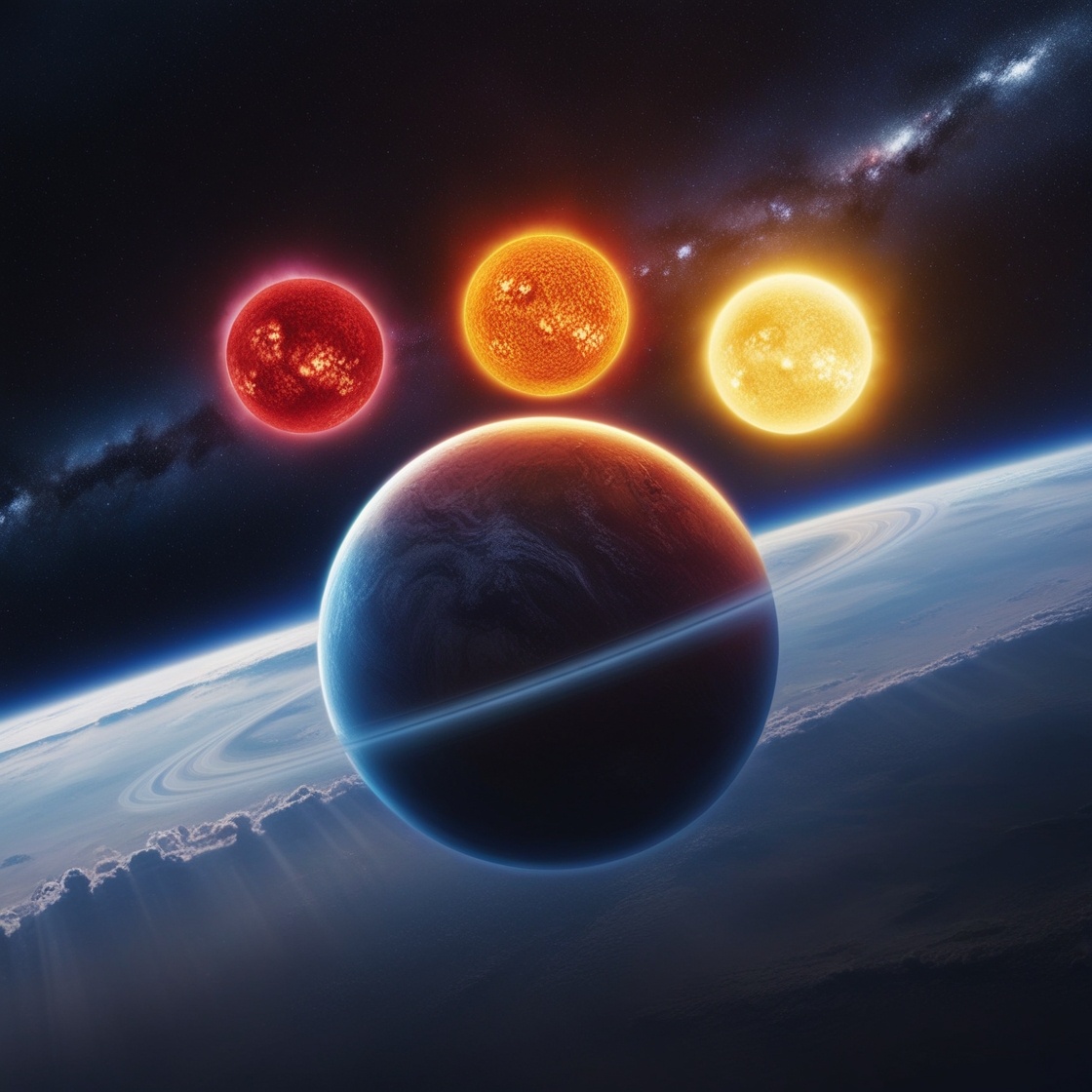Когда туман в голове Елены рассеялся, первое, что она увидела – три огромных солнца в лиловом небе. Два красных гиганта и одно белое светило создавали причудливый свет, окрашивающий местную растительность в сюрреалистические оттенки.