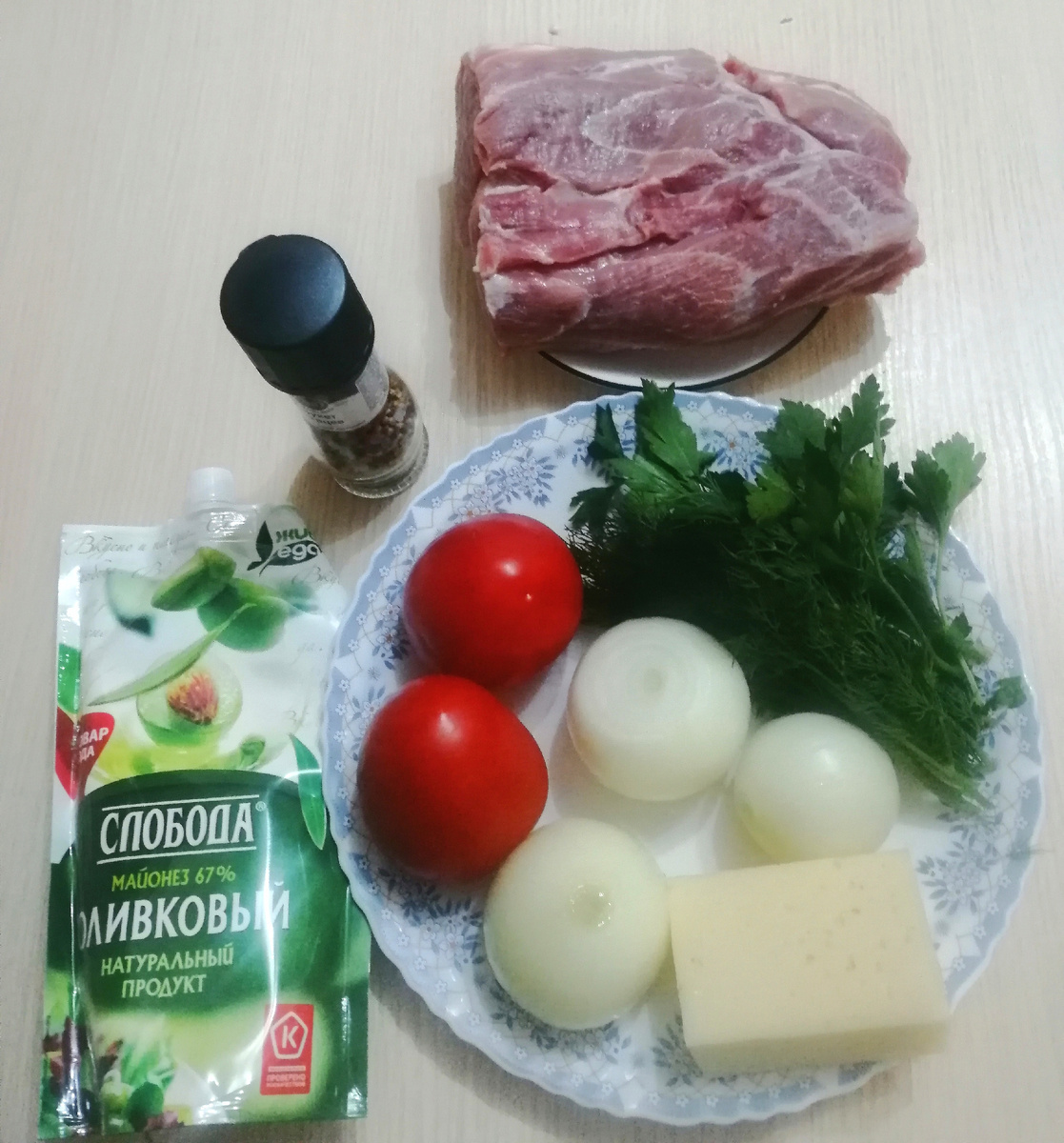 Друзья, всем привет! Самого доброго дня и самого хорошего предновогоднего настроения! Сегодня хочу поделиться рецептом блюда, которое будет на новогоднем столе наверное в каждой семье. И каждая хозяйка готовит его по-своему. Предлагаю приготовить мясо по-французски. Это горячее блюдо украсит любой праздничный стол, в том числе и новогодний. Пропорции продуктов писать не буду, всё зависит от того, сколько порций вам надо приготовить. Для приготовления нам понадобится: мясо (у меня свиная шея), лук репчатый, помидоры, сыр, майонез, соль, перец, другие специи, какие любите и зелень для подачи. Мясо нарезаем на кусочки толщиной 1,5 см и хорошенько его отбиваем. Присаливаем каждый кусок и обжариваем с двух сторон до образования румяной корочки. На другой сковородке обжариваем лук, нарезанный полукольцами, до золотистого цвета. Мясо выкладываем на противень или в форму для запекания, добавляем специи и сверху выкладываем жареный лук. Помидоры нарезаем тонкими кольцами и укладываем на к