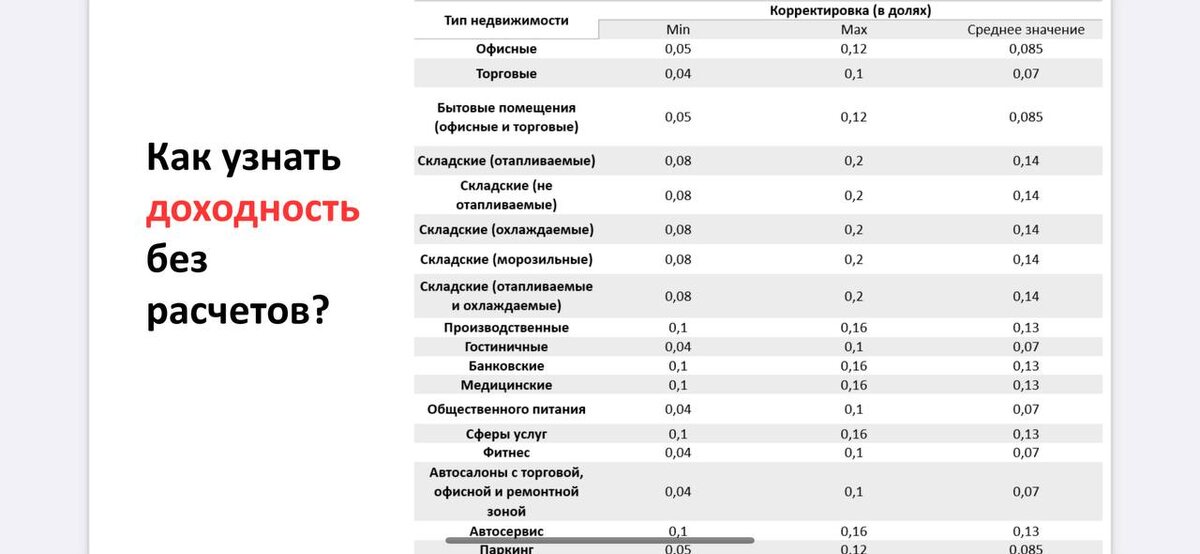 Недавно на лекции в рамках моего обучения на программе MBA «Управление в сфере недвижимости» я ознакомился с таблицей ставок капитализации для разных типов недвижимости. Делюсь этой ценной информацией с вами!