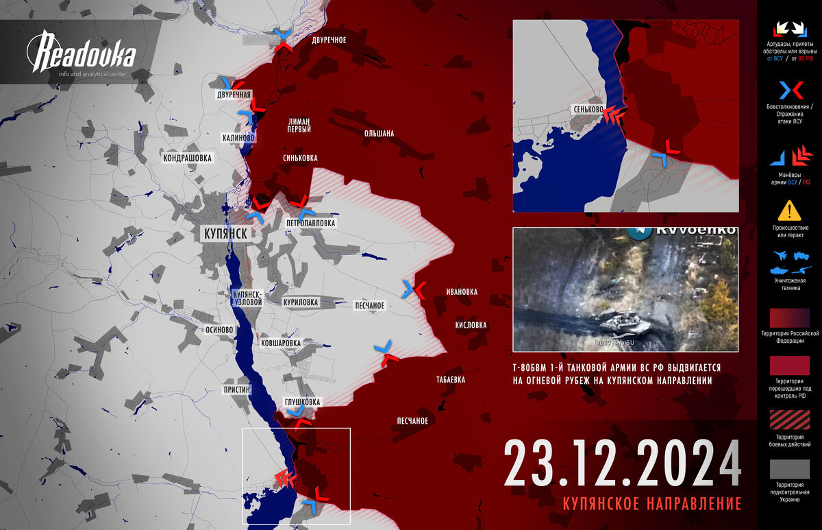 Редакция Readovka собрала самые важные события 23 декабря в разрезе СВО. Русские войска создали новый плацдарм за Осколом, на этот раз южнее Купянска. Нардеп Безуглая констатировала, что рядовые украинские пехотинцы де-факто рабы, обреченные на гибель..