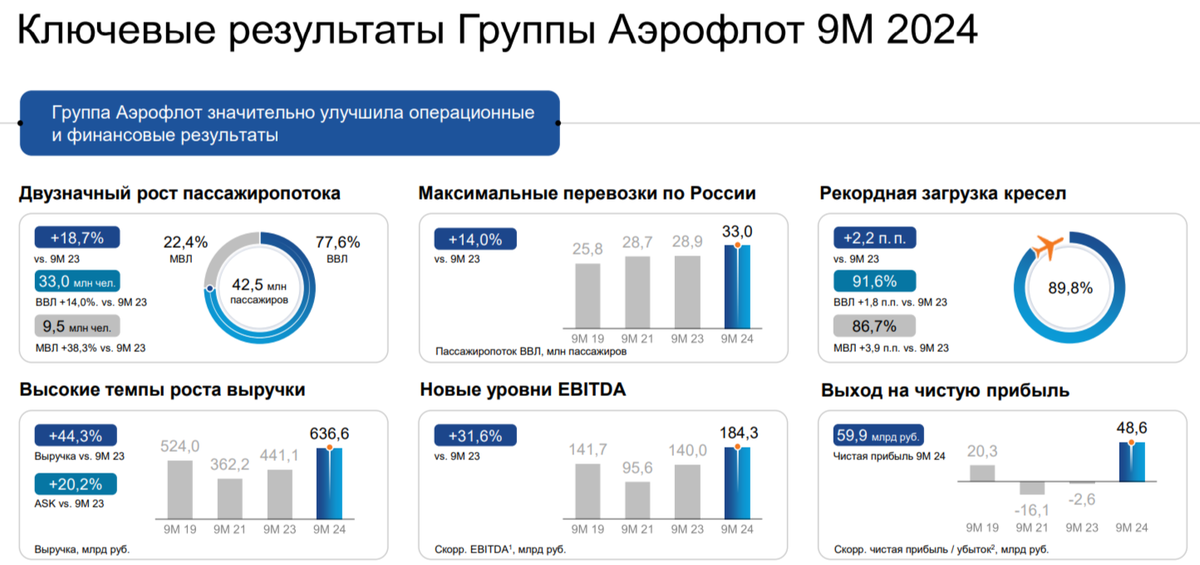 Аэрофлот представил нам фин. результаты по МСФО за III кв. и 9 месяцев 2024 г. Эмитент продолжает оставаться прибыльным, а не убыточным, как в 2023 г., но если углубиться в изучение отчёта, то прибыль сложилась из разовых эффектов и помощи государства. Рассмотрим для начала основные данные: ✈️ Выручка: 636,5₽ млрд (+44,3% г/г) ✈️ EBITDA: 182,2₽ млрд (+31,6% г/г) ✈️ Чистая прибыль: 59,9₽ млрд (в 2023 г. убыток -111,3₽ млрд) 💬 За 9 м. 2024 г. Аэрофлот перевёз 42,5 млн пассажиров (+18,7% г/г). На внутренних линиях пассажиропоток увеличился до 33 млн пассажиров (+14% г/г), на международных линиях до 9,5 млн пассажиров (+38,3% г/г). Процент занятости пассажирских кресел составил 89,8%, увеличившись на 2,2 п.п. год к году. 💬 Выручка возросла на значимый % благодаря росту пассажирооборота, объёму грузоперевозок (+16,4% г/г) и увеличению тарифов на внутренние (+22,9% г/г) и международные линии (+4,8% г/г). Опер. расходы увеличились до 554,1₽ млрд (+49,5% г/г, темпы выше, чем в выручке), глав
