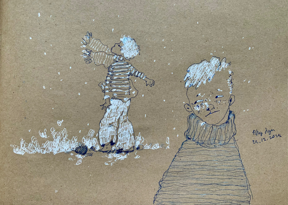 Рисунок синим линером и гелевыми ручками (белая и серебристая) на крафт-бумаге.
