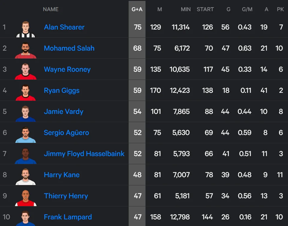 Аналитики из Statmuse сделали удобную таблицу игроков, которые наилучшим образом проявляли себя в матчах против так называемой big six – шестерки лучших команд АПЛ. Первоначально это была четверка, в которую входили «Манчестер Юнайтед», «Арсенал», «Челси» и «Ливерпуль», но с годами произошло расширение − добавились «Тоттенхэм» и «Манчестер Сити». Все благодаря долгой и кропотливой работе (и деньгам шейхов). На первом месте лучшего игрока по «гол + пас» против исторической топ-6 АПЛ самый недооцененный форвард в истории английской лиги − Алан Ширер из «Ньюкасла». В 129 матчах против лучших из лучших он забил 56 голов и отдал 19 голевых передач. На втором месте уже современный герой − Мохамед Салах из «Ливерпуля». Его темп набора очков сильно выше, чем у англичанина (0,63 против 0,43) и при меньшем количестве матчей (75 против 129) он уже забил 47 мячей и отдал 21 голевую передачу. Почетное третье место у нынешнего тренера «Плимута» и легенды «МЮ» Уэйна Руни − 135 матчей, 45 голов и 14 г
