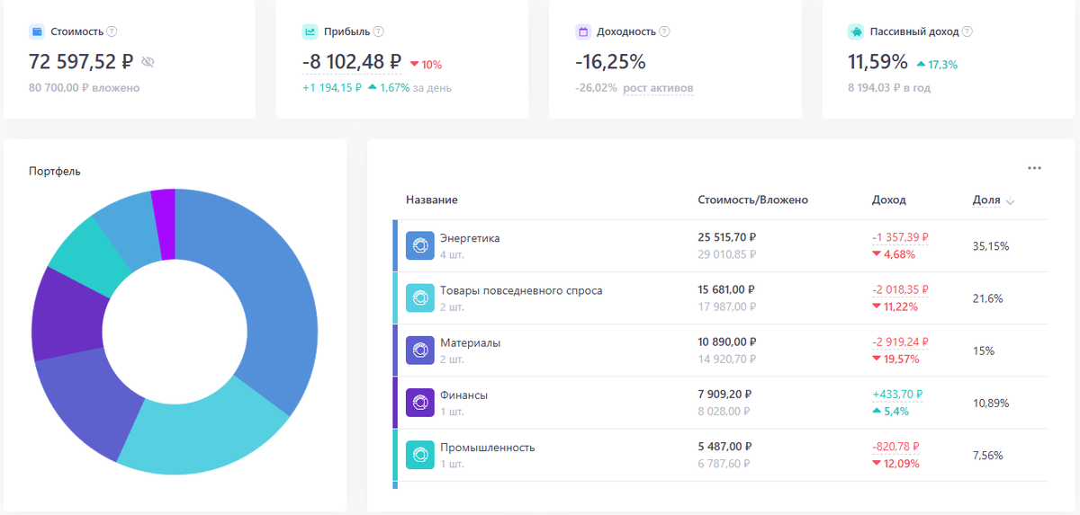 Хороший конец недели выдался. Да и понедельник ничего такой. ЦБ не поднял ставку и рынок отреагировал хорошим ростом. Ну и еще я молодец. Была чуйка, что так будет и решил купить акции Сбербанка до решения ЦБ и угадал. Иначе пришлось покупать почти на 10 % дороже. Ну а из пополнение только очередной вклад из кубышки на 1250 рублей. Про хорошие новости я уже написал выше, повторяться не буду. Рынок пока растет и доходность моего портфеля начинает выходить из глубокого минуса. На этой неделе, как и планировал, купил 1 лот ( 10 акций ) Сбербанк, АП по цене 230,3р. Всего у меня стало уже 30 акция со средней ценой покупки 268,48р. Это уже чуть ниже текущей цены, скоро может быть одна акция позеленеет. На сегодня со времени покупки Сбербанк вырос на 14 процентов. Я доволен. На данный момент мой портфель выглядит так: Здесь почему-то финансы уже позеленели, может я что-то не так посмотрел. Доходность сложилась вдвое, и правильно сказать- выросла. Было -31%, теперь -16%. Прогноз по дивиденда