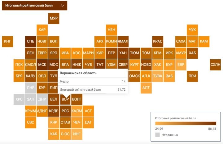 Воронежская область успешно закрепилась в топ-15 итогового рейтинга регионов России: в этом году она занимает 14-е место из 89 возможных, но уступила место своему ближайшему соседу, поделилось статистикой РИА «Новости».