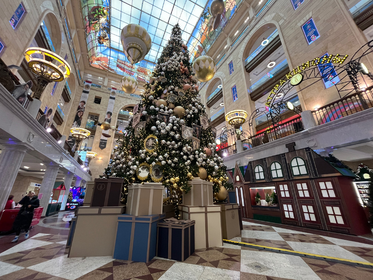Тут стоит красивая елка с подарками, сверху висят огромные часы и продаются разные вкусности. И летают большие воздушные шары.