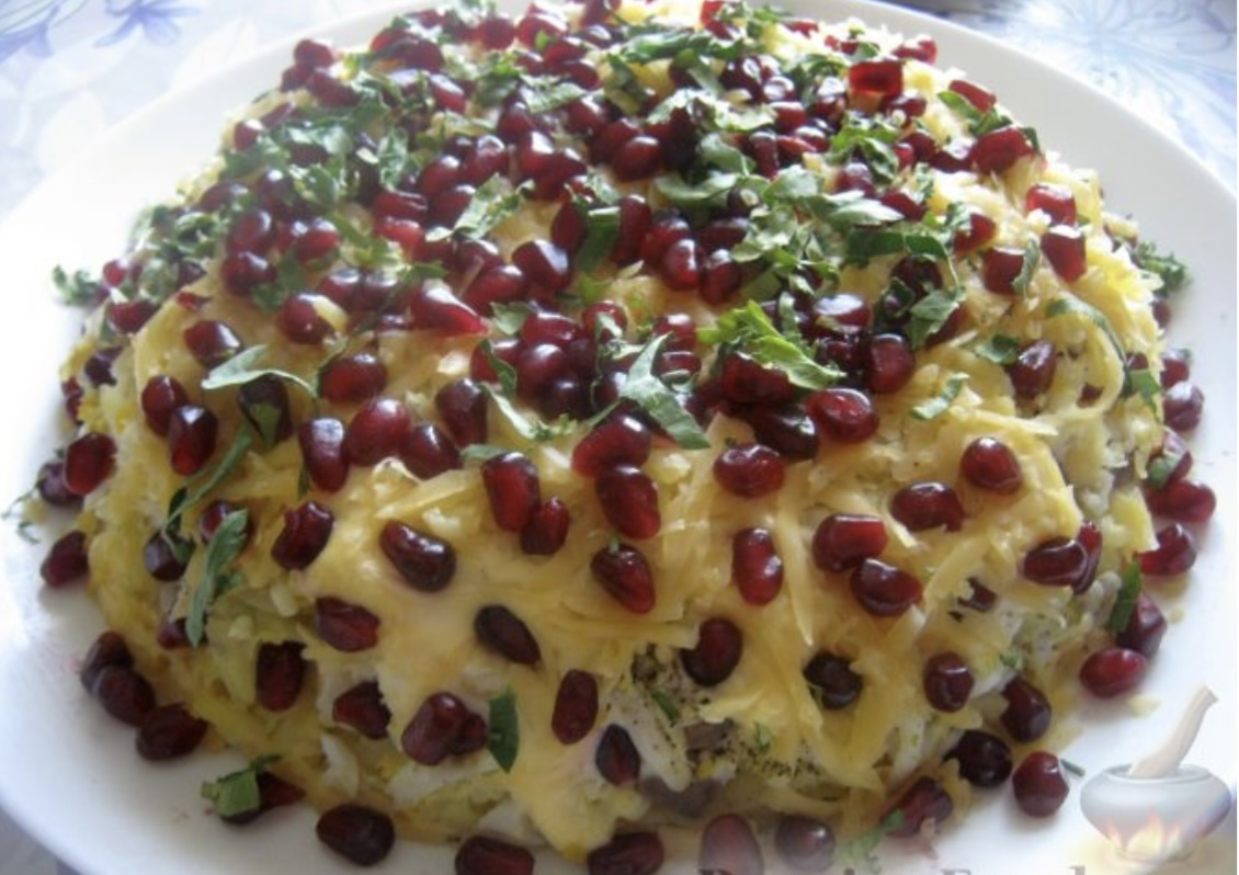 Ингредиенты : Картофель – 3-4 шт. Лук репчатый – 1-2 шт. Яйца куриные – 5 шт. Язык (свиной или говяжий) – 300г Сыр твердый – 200г Майонез - 150 г Соль - по вкусу Уксус- 1-2 ч. л Сахар - 1 ч. л Гранат Свиной язык замочить на час в холодной воде. Промыть. Залить холодной водой. Дать закипеть. Слить воду. Залить свежей водой. Дать вскипеть. Добавить соль и перец. Варить на небольшом огне под крышкой до готовности, около 60-90 минут. Затем сполоснуть холодной водой, снять кожицу, вырезать несъедобные места. Охладить. Взять плоское блюдо, салат «Капли страсти» укладывать слоями: 1 слой - картофель, слегка посолить, полить майонезом, равномерно распределить. 2 слой - язык. 3 слой - маринованный лук, майонез 4 слой - яйца, майонез. 5 слой - сыр, майонез. Салат «Капли страсти» украсить зернами граната. Дать настояться в холодильнике 2-3 часа. Салат «Капли страсти» готов. Приятного аппетита!