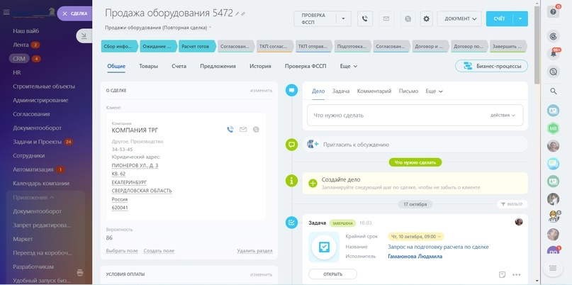 Решение настроено таким образом, что все основные согласования выполняются с помощью обязательных заданий в Битрикс24, а вся введенная информация сохраняется в прикрепленной карточке по продаже оборудования.