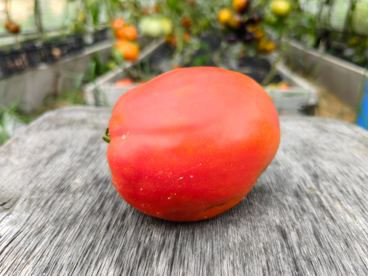 Красных и розовых в моих посадках много. Обычно примерно половина сортов в этой цветовой гамме. Очень многие любимые сорта именно из этой группы. И каждый год я надеюсь ее пополнить новыми сортами, которые пропишутся у меня на постоянное место жительства. Выбор у меня очень большой, семян залежи неимоверные, а высаживаю я не много, в районе 80-100 сортов каждый сезон. Их может быть и больше, но успешно выращивать удается в основном в теплице и парнике. Открытый грунт у нас это слишком большой риск (и практически гарантированный) потерять все от фитофторы. Обработки спасают очень условно. Этот томат я давно хотела испытать и провести сравнительную дегустацию со своими любимцами. К сожалению сравнительная со старожилами не состоялась, но вот результаты одной коллективной дегустации я таки записала в свою томатную тетрадку. Сорт этот всем известен. Индет, вела в два ствола. Урожайность заметно пострадала из-за кладоспориоза. Много завязей не состоялись. Тем не менее, какое-то количество