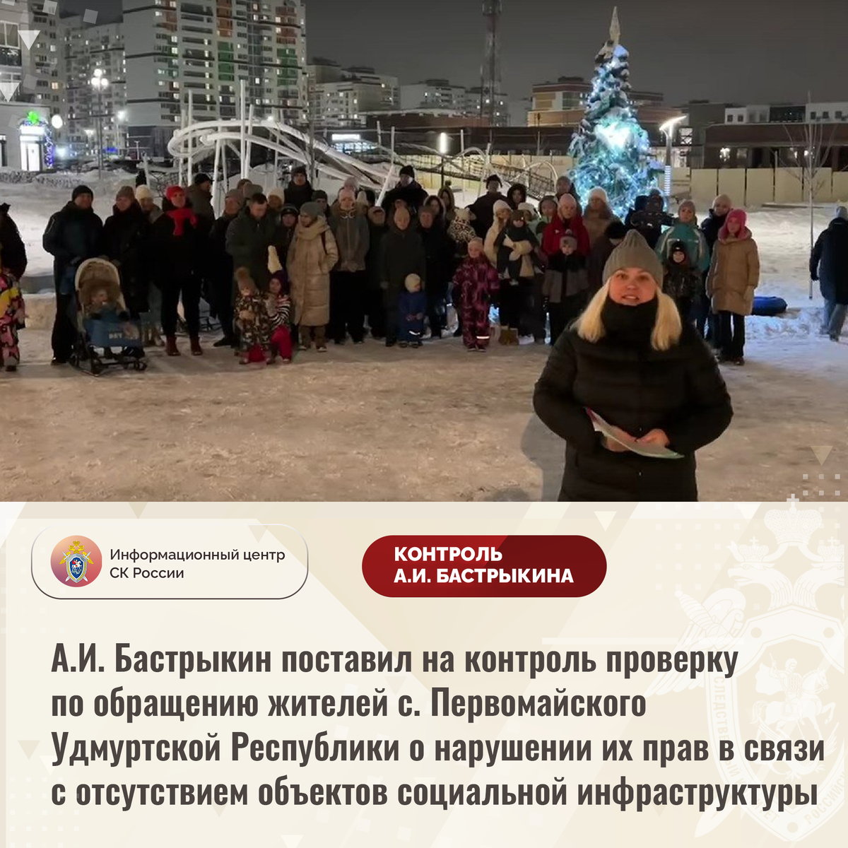 А.И. Бастрыкин поставил на контроль проверку по обращению жителей с. Первомайского Удмуртской Республики о нарушении их прав в связи с отсутствием объектов социальной инфраструктуры В комментариях в социальной сети размещена ссылка на видеообращение жителей села Первомайского Завьяловского района Удмуртской Республики о нарушении их прав. Несмотря на то, что населенный пункт расположен вблизи города Ижевска и в нем возведено несколько жилых комплексов, в которых проживают около 60 тысяч граждан, в селе отсутствуют объекты социальной инфраструктуры, в том числе школы, детские сады и поликлиники. Многочисленные обращения результатов не принесли, строительство образовательного учреждения запланировано только на 2030 год. Указанная ситуация получила распространение в социальной сети. В СУ СК России по Удмуртской Республике по доводам комментария начата процессуальная проверка. Председатель Следственного комитета Российской Федерации Александр Иванович Бастрыкин поставил ход процессуальной