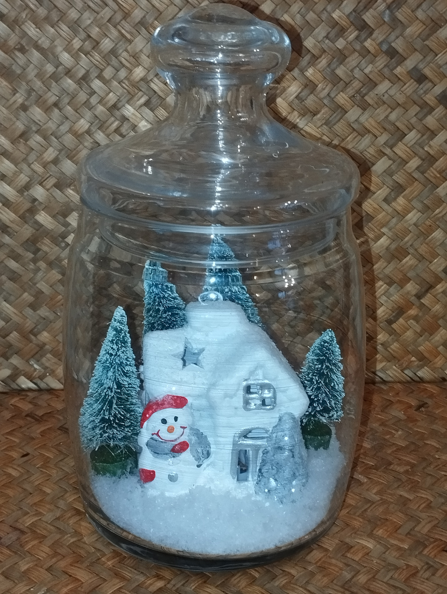 В этой банке я вообще не планировала делать никаких композиций. Там лежали палочки корицы. И стоит эта банка на открытой полке в кухне. Палочки корицы я использовала для декора венка, а пустая банка на полке вообще не смотрится. Вот и пришлось ее наполнить. Посадила внутрь снеговика.
