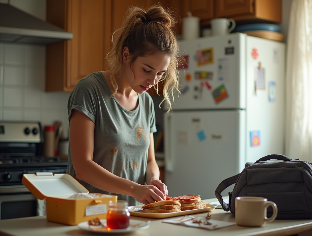 Её растрёпанные волосы выбивались из наспех завязанного хвоста, а на футболке расплывалось свежее пятно от томатного соуса – след неудачной попытки упаковать старшему сыну бутерброд.