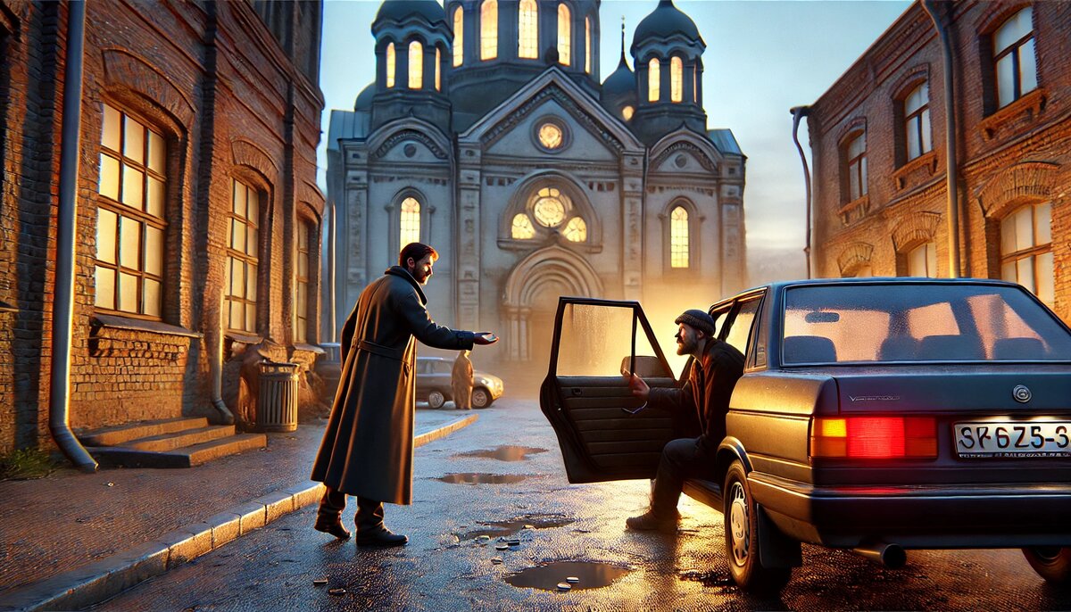 В тот день, когда Вадим ждал Полину у храма, он заметил как перед машинами проходил мужчина — в поношенной куртке, с растрёпанными волосами, а в его глазах читалась безысходность. Мужчина останавливался у каждого, прося мелочь, но большинство отворачивались. Когда он подошёл к машине Вадима, было видно, что ему неловко: