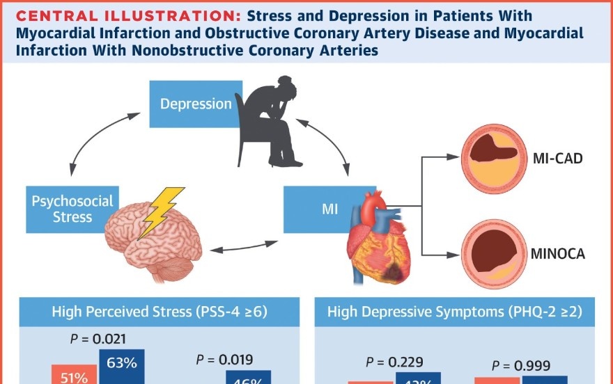 Это выражение является простым бытовым объяснением причины разных заболеваний. В том числе, сердечных. В том числе, инфаркта миокарда. Причины инфаркта хорошо известны. Но и "нервную почву" тоже нельзя забывать. Считается, что особое значение эта "почва" имеет в развитии инфаркта у женщин. Именно этому вопросу посвящена работа, опубликованная в последнем номере JACC: https://www.jacc.org/doi/10.1016/j.jacc.2023.08.028 В многоцентровое исследование было включено 314 пациенток с инфарктом миокарда с коронарной болезнью сердца (КБС), то есть более типичным инфарктом, связанным с обструкцией артерий сердца (средний возраст 64.2), и 172 пациентки с инфарктом миокарда без обструкции артерий сердца (MINOCA, или по-русски ИМБОКА) (средний возраст 59.4), что было значимо меньше, чем у пациенток с КБС. Участницы исследования во время наступления инфаркта и через 2 месяца отвечали на вопросы анкеты по оценке стресса (PSS4) и по выявлению симптомов депрессии (PHQ2). Более половины (51%) женщин с И