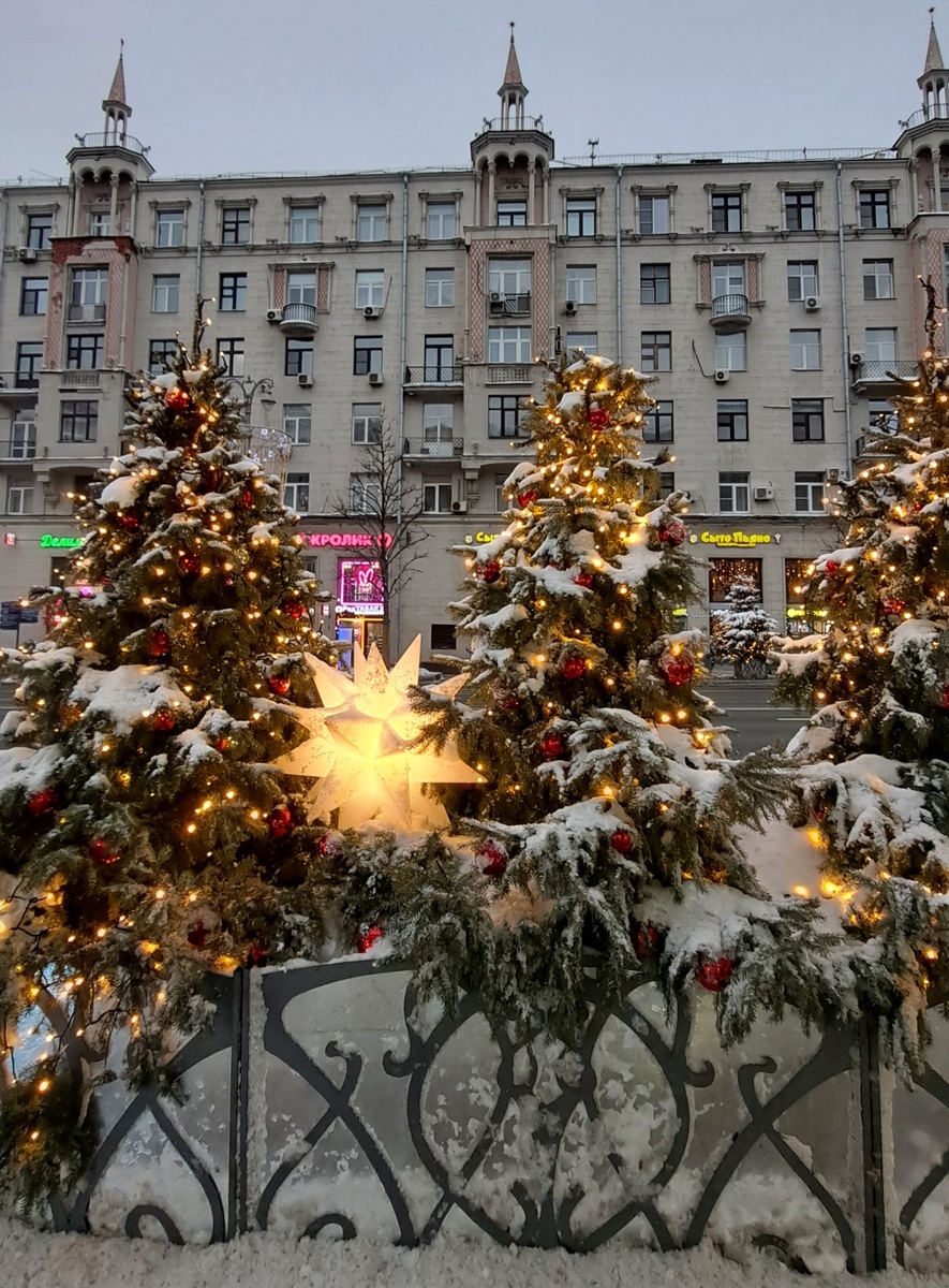Если идти от метро Тверская в сторону Охотного ряда, то прям у выхода из метро начинаешь любоваться заснеженными елями, установленными на протяжении всей улицы. В прошлые года такого не припомню.