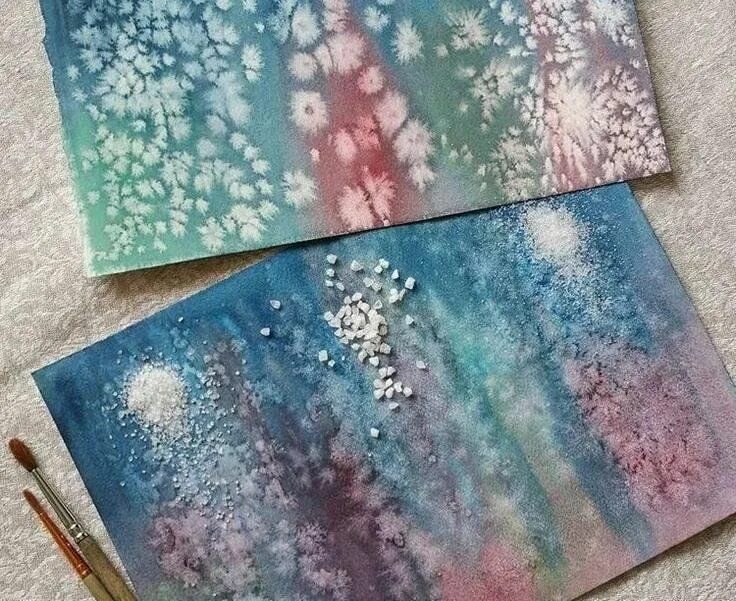 Когда вы посыпаете крупную или мелкую соль на влажную акварельную бумагу, соль впитывает краску, создавая уникальные, абстрактные текстуры. После высыхания соль можно удалить, оставив интересные узоры.