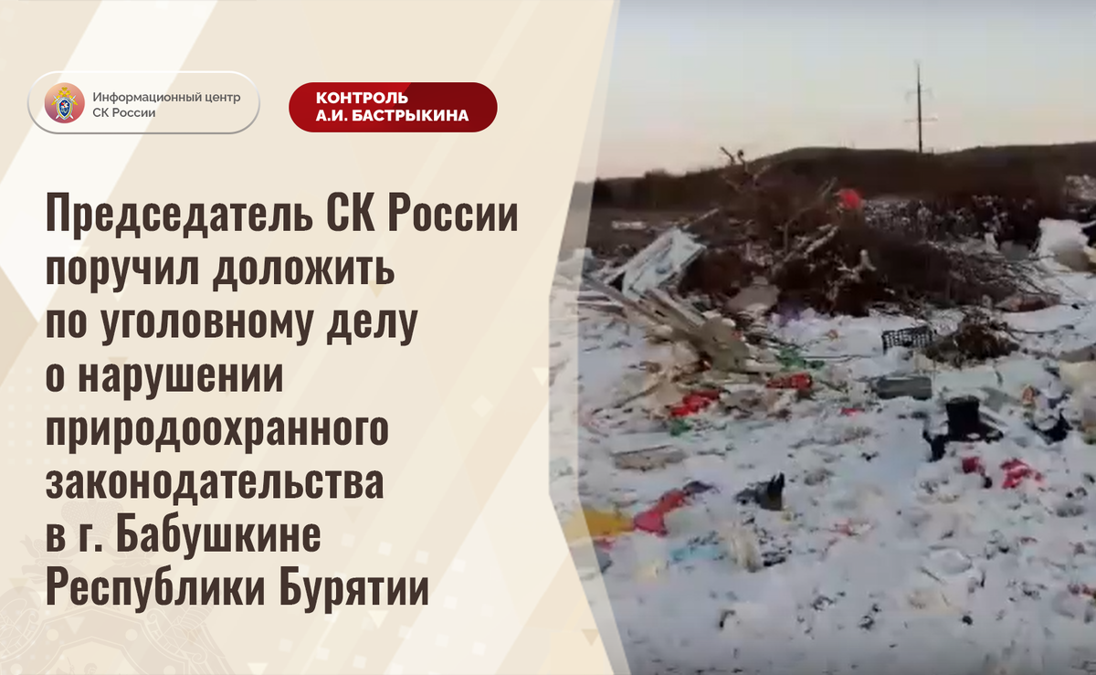 Председатель СК России поручил доложить по уголовному делу о нарушении природоохранного законодательства в г. Бабушкине Республики Бурятии В СМИ и социальной сети сообщается, что в городе Бабушкине Республики Бурятии на протяжении 20 лет функционирует несанкционированный полигон для хранения твердых бытовых строительных и промышленных отходов, площадь которого составляет 5 тысяч квадратных метров. Отмечается, что свалка расположена вблизи озера Байкал, автозаправочной станции и частных домов. Местные жители жалуются на распространение резкого неприятного запаха, а также регулярные возгорания свалки в летний период, однако мер к устранению нарушений длительное время не принимается. В СУ СК России по Республике Бурятии по данному факту возбуждено уголовное дело. Председатель Следственного комитета Российской Федерации Александр Иванович Бастрыкин поручил и.о. руководителя СУ СК России по Республике Бурятии Антону Владимировичу Золотоеву доложить о предварительных и окончательных результа