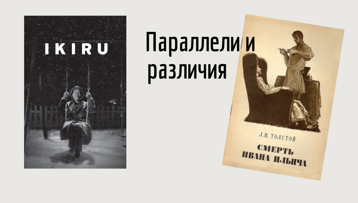 Фильм Куросавы «Жить» основан на повести Толстого «Смерть Ивана Ильича». У этой экранизации различий с первоисточником больше, чем в случае с «На дне». Давайте разбираться вместе. Композиции обоих произведений как бы отзеркаливают друг друга. Первая часть повести Толстого - поминки Ивана Ильича, вторая — рассказ о его жизни. В фильме «Жить» наоборот сначала показывают жизнь чиновника Кандзи Ватанабэ. Затем поминки. Это неспроста . В случае Ивана Ильича факт его смерти более важен, интересен, чем факт его жизни. Поэтому поминки — первая часть повести.