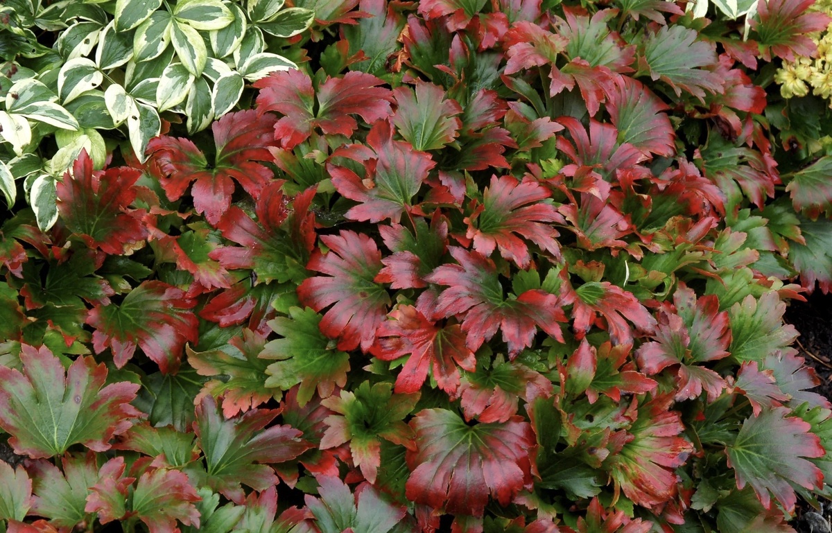 Красивое и яркое невысокое многолетнее растение с декоративными листьями, похожими на листья клёна. Листья кожистые, плотные, гладкие, тёмно-зелёные, сердцевиные или 5-8 дольчатые, по краю зубчатые или глубоко надрезанные на невысоких (около 30–40 см.) черешках отрастают от толстого чешуйчатого корневища, которое располагается близко к поверхности грунта.