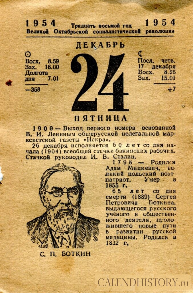 Итак, сегодня 24-го декабря и у нас на календаре 1954-й год. Перед нами листок советского календаря Политиздата. На календаре у нас пятница - 24 декабря 1954-го года. С. П. БОТКИН 1900 — Выход первого номера основанной В. И. Лениным общерусской нелегальной марксистской газеты «Искра». 26 декабря исполняется 50 лет со дня начала (1904) всеобщей стачки бакинских рабочих. Стачкой руководил И. В. Сталин. 1798 — Родился Адам Мицкевич, великий польский поэт патриот. Умер в 1855 г. 65 лет со дня смерти (1889) Сергея Петровича Боткина, выдающегося русского учёного и общественного деятеля, проложившего новые пути в развитии русской медицины. Родился в 1832 г. *** Оборотную сторону листка этого календаря можно посмотреть у нас по ссылке на сайте. Другие листки советских календарей смотрите у нас на сайте - CALENDHISTORY.ru ПОСМОТРИТЕ ЕЩЁ ЛИСТКИ ОТРЫВНЫХ КАЛЕНДАРЕЙ: