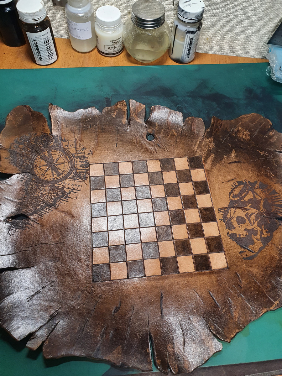 Один из самых необычных заказов за последние несколько лет🔥 Есть у мужиков такая традиция: на рыбалке вечером, под "рюмочку чая", в шахматы играть. И вот, на день рождения одному из участников этого "шахматного клуба" друзья решили сделать вот такой подарок — шахматную доску на коже. Сначала я хотел отказаться от этого заказа, так как не понимал, как это должно быть реализовано. Не спал две ночи и вот оно: Доска в стиле пиратской карты☠️ Работы было много, переделывал несколько раз. Эффект старения кожи вообще в тот момент был для неизведанным процессом. Информации нигде не было. В общем, две недели проб и ошибок, полученный опыт и знания, и на свет родилась новая уникальная вещь💥 Заказчик был приятно удивлен таким решением и остался доволен. А это для меня самое главное!