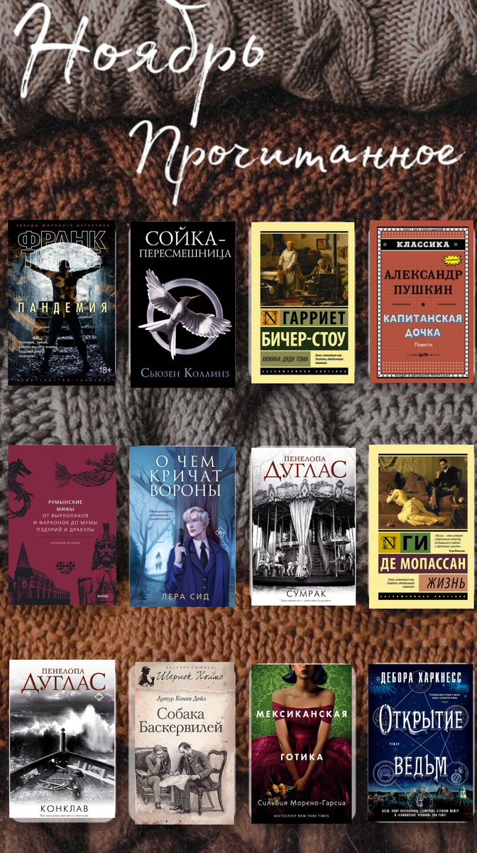 Привет всем читающим! Уже конец декабря, а я вспомнила, что не поделилась ноябрьскими итогами. Чтобы потом не было путаницы - делюсь) Покорение цикла - единственное, что в этом году всегда идёт по плану. Даже отзыв на эту часть выложила: Заключительная часть трилогии, где наконец расставлено все по своим местам. Часть, где Китнисс оказывается вынуждена втянута в противостояние, в символику сопротивления. И конечно она жаждет покарать зло, но осталось лишь разобраться, а где злодей. Восполняла пробелы среди детской зарубежной классики. Давно хотела почитать, история неплохая. Конечно то, что было показано в книге - ужасно. И того самого Тома жалко до безумия. А тут я уже исправляла пробелы в отечественной классики. Хотя "Дубровский" и был у меня прочитан, я ничего из него не помнила, так что читала как в первый раз. И очень понравилась история! Жаль, что в школе я не оценила ее по достоинству. Вот честно, про Румынию я знаю лишь о Дракуле, а тут такой пласт всего. Начиная от их р