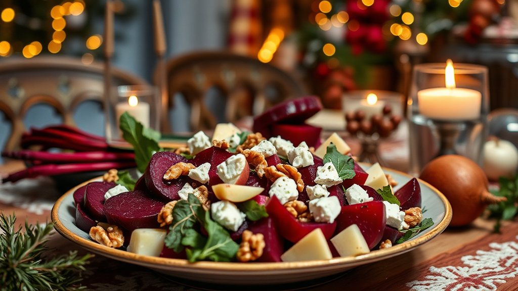 Салат из свёклы от которого сложно отказаться. Готовлю на все праздники Представьте себе уютный вечер, когда за окном мягко падает снег, а внутри дома царит тепло и свет. На столе уже разложены праздничные блюда, и каждый момент пропитан ожиданием волшебства. Вот тут-то и появляется мой салат из свёклы — яркий и ароматный, он моментально привлекает внимание и вызывает улыбки на лицах родных. Этот салат станет не только прекрасным дополнением к вашему ужину, но и отличной основой для дружеских встреч или семейных праздников. Ингредиенты 3 средние свёклы — лучше всего местные, свежие, с ярко-бордовым цветом 100 г грецких орехов — придающих салату неповторимый вкус 2 небольшие яблоки — для свежести и легкой кислинки 50 г сыра Фета — для кремового акцента 3 ст. ложки оливкового масла — отборного, первого холодного отжима 2 ст. ложки уксуса (по желанию) — для пикантности Соль и черный перец по вкусу Приготовление Начнем с отваривания свёклы. Поместите её в кастрюлю, залейте водой и варите о