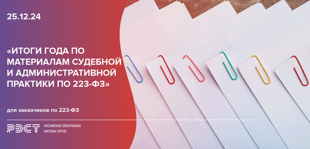 Вебинар «Итоги года по материалах судебной и административной практики по 223-ФЗ» будет направлен на анализ практических примеров закупок по 223-ФЗ. Рассмотрим наиболее интересные прецеденты 2024 г. На вебинаре мы рассмотрим с вами примеры административной и судебной практики 2024 г., отметим нюансы обоснования той или иной позиции, немного поговорим об анонсируемых изменениях законодательства о закупках отдельными видами юридических лиц. Вебинар будет интересен как заказчикам, так и поставщикам, а также лицам, интересующимся закупками по 223-ФЗ. Дата: 25.12.2024 Время: 13:00 (МСК) Участие бесплатное, регистрация обязательна - https://lp.r-est.ru/itogi_goda