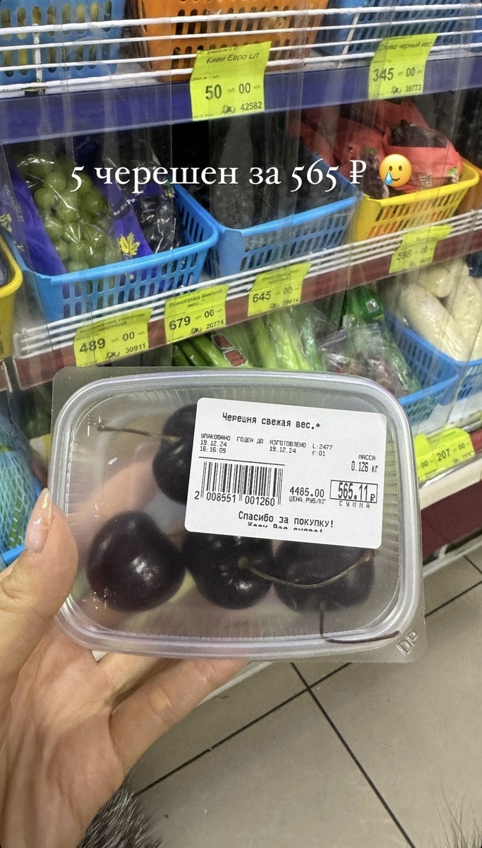 5 черешен за 550 рублей! Не знаю, как вам. А я посмеялась. Чудеса творятся в магазине! Или вот, продавец гимнаст. Я даже заволновалась, можно же упасть, или застрять в холодильниках. Потом еще и на сыры встала своими ногами.