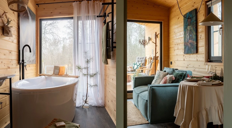 Мы часто рассказываем про современные деревянные дома. Сегодня покажем один из таких — его площадь всего 31 квадратный метр, но внутри поместился традиционный уют и современный комфорт. Это яркий пример того, как и в наше время можно построить экологичный и бюджетный дом. Домик принадлежит дизайнеру Евгении Пестовой, он стоит в окружении природы, неподалеку от Рузы в Московской области. Внутри все просто и лаконично, но в то же время душевно. Всего три комнаты: кухня-гостиная, спальня и ванная комната. Отделка: когда дерево — главный герой Чтобы сохранить связь с окружающей средой, Евгения выбрала натуральные материалы. Стены и потолок обшиты вагонкой с минимальной обработкой — только защитный состав, чтобы дерево дышало и радовало своей текстурой. Пол застелен утепленным линолеумом, который выглядит как темное дерево. Такой подход визуально объединяет все помещения. Даже в ванной отказались от привычной плитки и керамогранита. Очень нестандартное решение! Мебель: всё по делу Евгения р