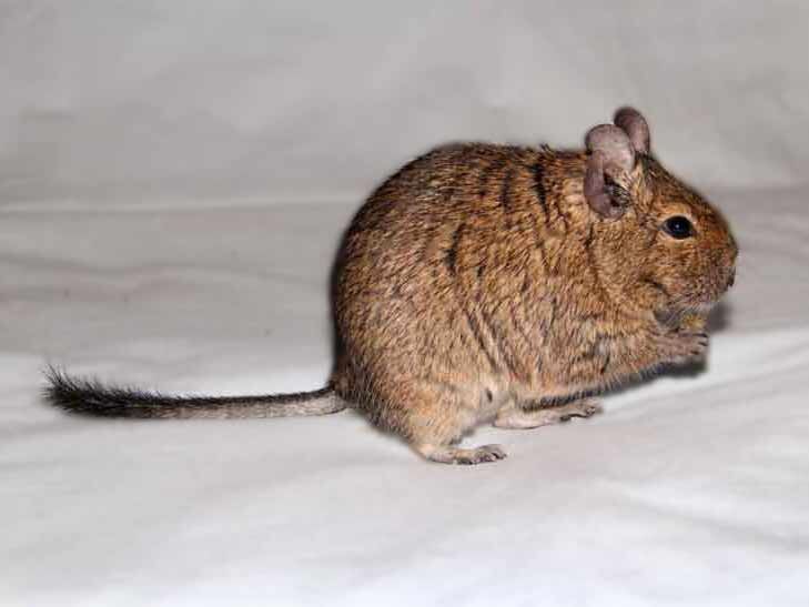 ID814 Длина хвоста дегу или чилийской белки у разных особей может быть от 6,5 до 10,5 см. Сам стержень хвоста грызуна от основания покрыт жесткими волосками, а на кончике волоски мягкие, в виде кисточки. Хвостик дегу необходим как противовес и помогает животному высоко прыгать (до 1 метра) и лазить по кустарникам и небольшим деревьям. Хвостик у животного устроен очень интересно: если грызун защемит его или прижмет чем-нибудь или же если кто-то из домочадцев схватит за хвост зверка слишком сильно, то кожа с хвостика слезет, словно чулок и останется в руках человека (или зубах хищника, если дело происходит в дикой природе). А вместо кисточки останется только белый кончик. Через несколько дней поврежденная часть хвоста подсохнет, и животное отгрызет ее самостоятельно. В итоге, зверек останется на всю жизнь куцым. Поэтому никогда не ловите дегу за хвост, к хвосту лучше вообще лишний раз не прикасаться! Также подбирая колесо для домашнего питомца, смотрите, чтобы оно было безо