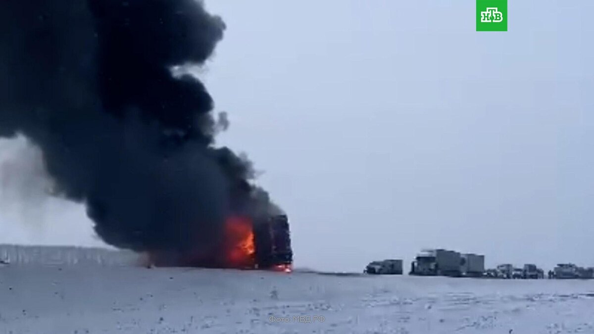 Крупное ДТП произошло на 961-м километре автодороги Р-255 «Сибирь» в Красноярском крае. По информации краевого МВД, на трассе столкнулись два грузовика и легковой автомобиль Toyota. От удара фуры загорелись.