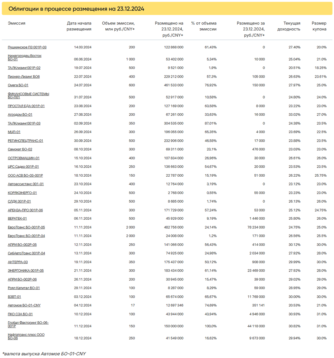 23 декабря новых размещений не было. Суммарный объем торгов в основном режиме по 485 выпускам составил 1794,8 млн рублей, средневзвешенная доходность — 24,49%. 📊 Подробнее в ВДОграфе Больше актуальных новостей читайте оперативно в нашем телеграм-канале