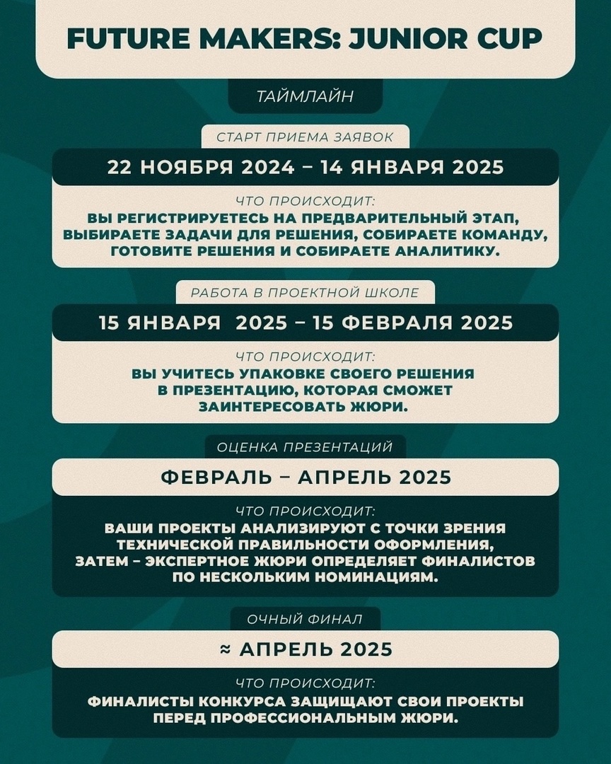 ➖ два трека: инженерный и городской. ➖Все задачи предоставлены ведущими российскими и международными компаниями и администрациями городов из реальной практики. ➖ Конкурсанты разрабатывают и защищают проект-кейс с предложением инновационного, креативного и понятного технического решения. ⚪️ Принять участие в «Future Makers: Junior Cup» могут студенты (бакалавриат или специалитет). ⚪️ Соревноваться можно как индивидуально, так и в команде (до 4 человек + наставник). ⚡ Прием заявок идет прямо сейчас и продлится до 14 января 2025 года! Подать заявку и ознакомиться с деталями участия 👉 на сайте «Future Makers: Junior Cup». 📍Больше новостей читайте здесь: https://vk.com/news_kuzstu