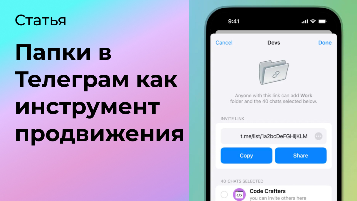 Несмотря на популярность, многие недооценивают функционал папок в Telegram, считая их лишь инструментом для организации личных чатов. При этом грамотное использование папок может стать эффективным инструментом в арсенале маркетолога. Ранее я уже рассказывал, как папки в Телеграм помогают привлечь новых подписчиков. В этой статье поделюсь личным опытом использования папок. Пока тема с шарингом папок в телеге ещё жива, поделюсь своей папкой ребят из IT-Agency Внутри 14 каналов крутейших специалистов, которых знаю лично: джедаи (перформанс-маркетологи), специалисты по SEO и ASO, редакторы, руководители агентства и менеджеры. Со многими из них поработал бок о бок: затаскивал неподъёмное, тушил горящие проекты, ошибался и учился. Не все каналы про работу. К примеру, внутри папки есть каналы про отдых в Крыму, обзоры на всякие бьюти-штуки и мемы. Можно подписаться на всю папку целиком, либо выбрать галочками тех, кто вам интересен. Ещё раз ссылка на папку, подписывайтесь → https://t.me/addli