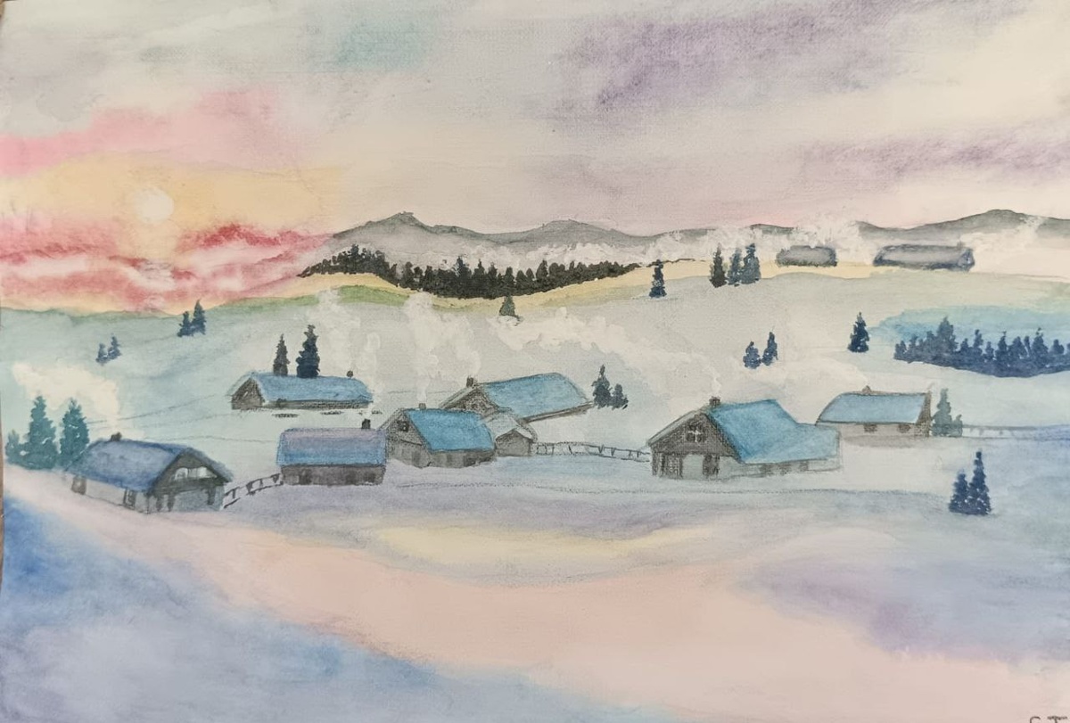 "В этот морозный зимний день, когда снег покрыл все вокруг, а солнце только начинает свой восход, мы видим, как дома окутаны дымком из труб. Люди в своих домах спят и видят сны. Вокруг тишина и спокойствие, которые напоминают нам о том, что жизнь продолжается, несмотря на все трудности и препятствия." Такой текст мне сочинила нейросеть на тему картинки про морозное утро, которое мы рисовали с нашими участниками Группы Московского долголетия. Я предлагаю вашему вниманию работы выполненные в акварели. И не судите строго... Эти прекрасные картины созданы не профессионалами но Любителями с большой буквы!!!! Приятного просмотра! Кажется снег хрустит, слышите? А здесь солнышко подмигивает зрителю весело и игриво. Пушистый снег кружится в танце) Новогодние открытки для вашей радости! Друзья, с наступающим новым годом! И помните, что талантливыми не рождаются ими становятся найдя для себя любимое занятия и развиваясь в нем. Еще раз убеждаюсь, что найти любимое з