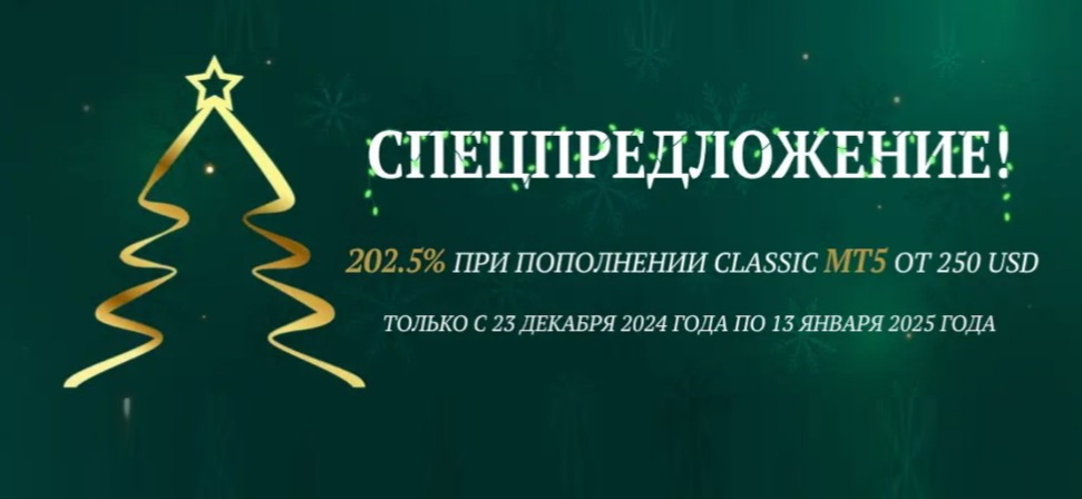 FreshForex поздравляет с Новым годом, Рождеством и подготовил праздничные сюрпризы! Пусть каждая инвестиция приносит успех и укрепляет финансовое благополучие! С 23 декабря 2024 года по 13 января 2025 года: Праздничный бонус 202,5% на каждое пополнение! При пополнении счёта от $250 на платформе MetaTrader 5 ты получишь бонус, который: Подробнее о бонусе... Конкурс Новогодний профит 202mt5! Закрывай сделки объёмом от 0.25 лота на платформе MetaTrader 5 и участвуй в розыгрыше: Больше сделок – больше шансов на победу! Начни 2025 год с FreshForex с максимальной выгодой! Успех уже ждёт тебя – действуй прямо сейчас! Принять участие в акции!