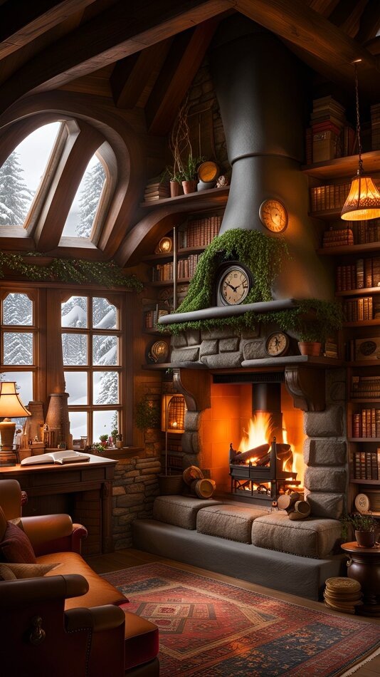 Пошкурим доски, покроем их лачком, повесим полки для своих историй, устроим чудесный камин, мягкий диван с подушками и пледом, и будем коротать там минуты приятного отдыха с чашкой горячего вкусного напитка...