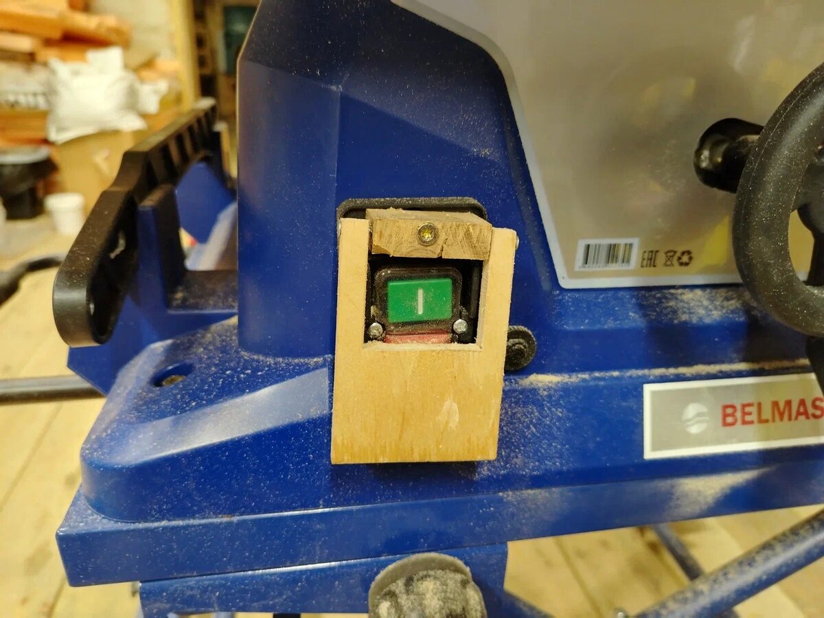 Чуть более года назад я променял BLACK+DECKER BES720 на BELMASH TS-255MR. О своем решении пока не пожалел, но и замену идеальной назвать не могу. Есть ли они вообще, идеальные станки. Первой переделкой была кнопка выключения станка. Сначала был вариант из того, что валялось под ногами. Так же установил трехпроводной блок плавного пуска. Затем переделал на более эстетичный вариант. Вынес кнопку вперед, теперь пилу удобно выключать коленом. Купил кнопку с педалью на озоне, дремелем вырезал в ней отверстие для штатной кнопки (она шестиконтактная, готового варианта не нашел), плюс купил кнопку с корпусом, которую использовал для изготовления проставки, чтобы выдвинуть кнопку вперед.по телефону Так же был доработан упор. Читал, что можно вставить внутрь брусок, но для себя выбрал вариант с внешней накладкой. При зажиме упор деформируется и сгибается в центре. Явная недоработка. Переделал аспирацию. Изначально опилки шли в пылесос. Но хочется, чтобы опилок летало меньше, переделал на отведен