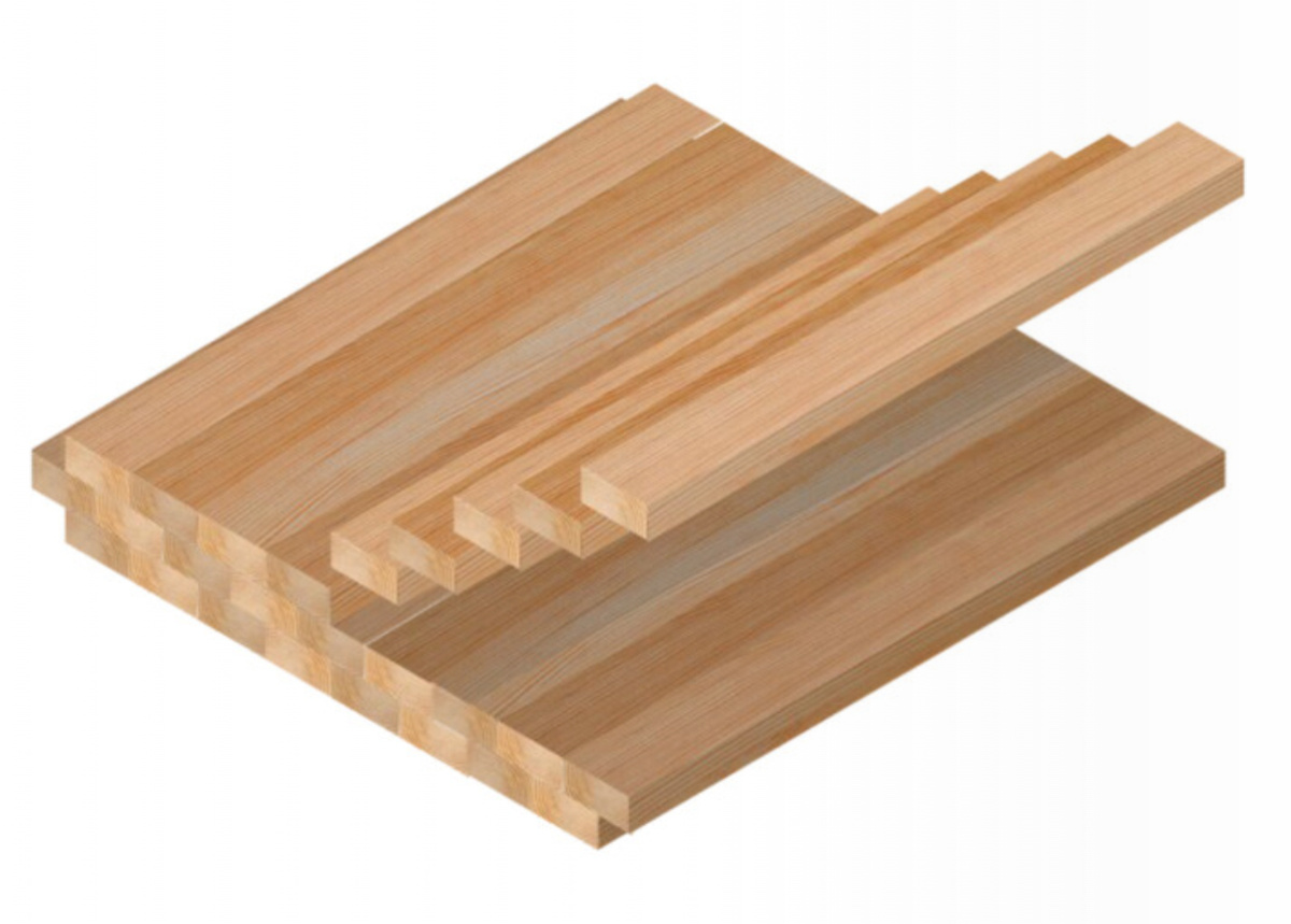 Англоязычный термин «mass-timber» обозначает целый класс конструкционных материалов из древесины, которые получают путем соединения в единый массив отдельных деревянных элементов – ламелей. К наиболее распространенным таким материалам относятся клееный брус и панели: CLT, DLT и NLT. 1. Клееный брус изготавливают путем склеивания ламелей, ориентированных в одном направлении. Англоязычное название материала: glued laminated timber, сокращенно – glulam. Используют также аббревиатуру GLT. 2. CLT-панели изготавливают путем склеивания ламелей под прямым углом друг к другу. Аббревиатура CLT образована от англоязычного термина – cross laminated timber (поперечно склеенная древесина). 3. DLT-панели отличаются тем, что в них ламели соединяются с помощью дюбелей из более твердой древесины, чем древесина ламелей. Аббревиатура DLT образована от англоязычного термина – dowel laminated timber (древесина, скрепленная дюбелями). 4. NLT-панели отличаются от DLT-панелей тем, что вместо дюбелей для соедин