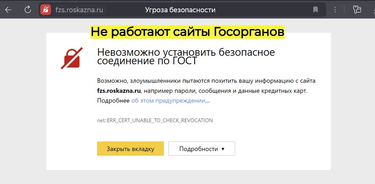 При открытии "Портала заявителя" Федерального казначейства https://fzs.roskazna.ru/ или любого другого сайта госоргана РФ может появится уведомление о недействительности сертификата. В зависимости от браузера название ошибки может отличаться: net::ERR_CERT_UNABLE_TO_CHECK_REVOCATION для Яндекс браузера и ERR_SSL_VERSION_OR_CIPHER_MISMATCH для Chrome Для решения проблемы требуется установить новый корневой сертификат МинЦифры. 1. Скачать сертификат по ссылке https://gu-st.ru/content/lending/RootCa_SSL_RSA.zip 2. Нажать "Открыть" после скачивания. 3. Два раза кликнуть по сертификату безопасности. 4. Нажать "Открыть" в окне уведомления. 5. Нажать "Установить сертификат" 6. В "Мастере импорта" выбрать "Текущий пользователь" и нажать "Далее". 7. Выбрать "Поместить все сертификаты в следующее хранилище" и нажать "Обзор" 8. Выбрать "Доверенные корневые центры сертификации" и нажать "Ок". 9. Нажать "Далее" 10. Нажать "Готово" 11. Нажать "Ок" и перезагрузить страницу в браузере. Теперь Портал о