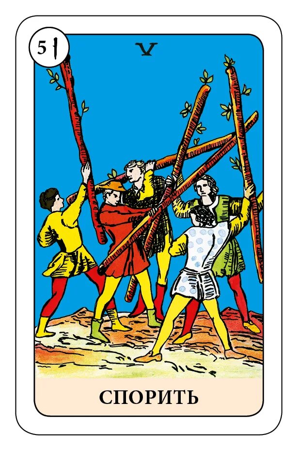 Пятерки: суть карты - Необходимость переступить какой-либо барьер, чтобы выйти на другой уровень. Выход из зоны комфорта, описываемой Четверками, переживания и боль по этому поводу. Вечная дилемма: синица в руках или журавль в небе. Сравнение. Сравнение своей социальной роли с другими. "Меряние кое— чем" (простите!) с целью доказать, что тоже не лыком шит. Но двух победителей не бывает.
