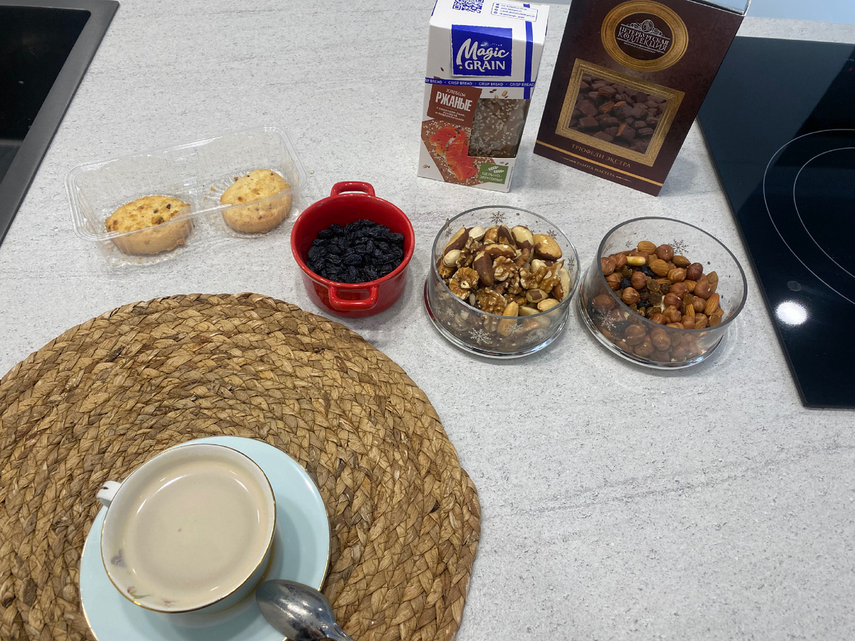У нас с сестрицей всё гораздо скромнее. Мы с ней проснулись, по кружечке молока с сухариками и всё, а у соседушки надо обязательно орешек съесть хоть один, они полезные.