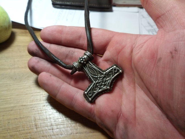 Ну, что, по внешнему виду он - молот Тора. Кажется сделан из какого-то белого металла, может серебра, а может из какого-то декоративного сплава.