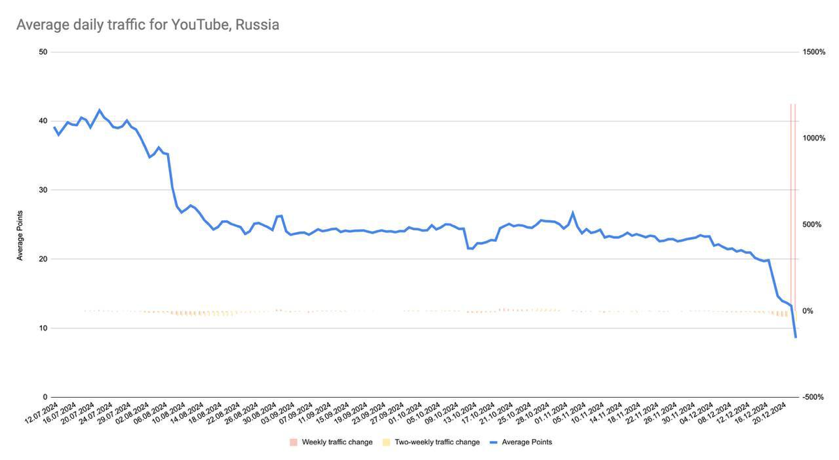В ТГ - нашествие разных интерпретаций новости, что YouTube в России фактически заблокирован. И во всех постах одна и та же картинка. Вот, мол, смотрите, как уменьшалось количество россиян, которые смотрят YouTube. Мол, падение в пять раз, до 20%. Честно говоря, удивлен, что 20% еще смотрят. Думал, что трафик YouTube из России давно мизерный, околоноля. Подозревал, что россияне давно смотрят YouTube только через VPN, маскируясь под европейцев, индусов, пакистанцев… Ошибся! Был неправ! Оказывается еще порядка 20% зрителей YouTube из России не пользуются VPN. Пока не пользуются…